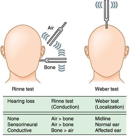 Существует много тестов. Однако в повседневной практике для дифференциальной диагностики поражения звукопроводящего или звуковоспринимающего аппарата достаточно применить 3 простых теста – Федеричи, Ринне и Вебера.
