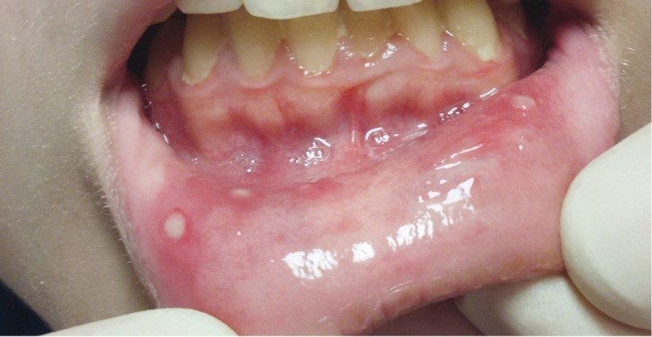 Афтозный стоматит - язвы располагаются на слизистой оболочки губ и щёк. Этот признак проявляется примерно у 40-80% пациентов.