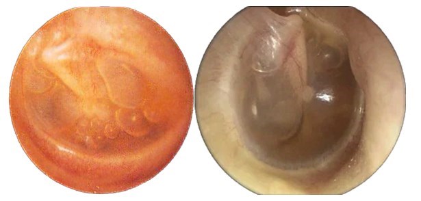 Внешне экссудативный отит у взрослых проявляется изменением цвета барабанной перепонки на сероватый или желтоватый. На осмотре у лор-врача обнаруживаются усиленные опознавательные знаки, смещение светового рефлекса, ретракция легкой или умеренной степени выраженности. Через перепонку могут быть видны воздушные пузырьки или газо-жидкостной уровень.