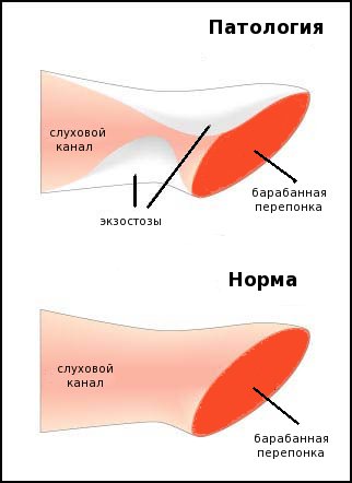 Экзостозы - костные образования наружного слухового прохода, имеющие ножку или плоские с широким основанием. Первые можно встретить в области кольца наружного слухового прохода, вторые чаще всего развиваются на его стенках. Их размер обычно незначительный, в пределах булавочной головки. Но они могут вырастать до большой величины и полностью закрывать просвет прохода (оставшаяся часть, как правило, заполнена ушной серой или частичками эпидермиса).