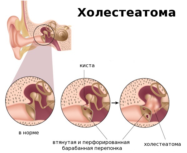 Кроме кариозных поражений симптоматика заболевания часто предполагает формирование холестеатомы – разрастание эпидермальной ткани на костные стенки слухового прохода. Такое наслоение способствует скоплению эпидермиса в барабанной полости. Такие новообразования напоминают опухоль, которая за несколько лет достигает больших размеров, приводя к серьезным внутричерепным и другим осложнениям.