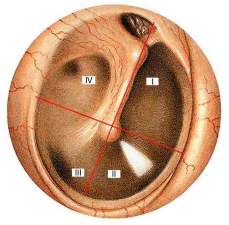 - латеральный отросток, складки и рукоятка молоточка, световой конус и некоторые другие части. Все вместе они составляют четыре условных квадранта — передне- (I) и задневерхний (IV) и передне- (II) и задненижний (III) (см. рис. 1).